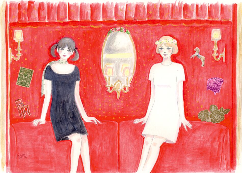「ひなぎく」の2人の女の子が、赤い部屋でおどけて